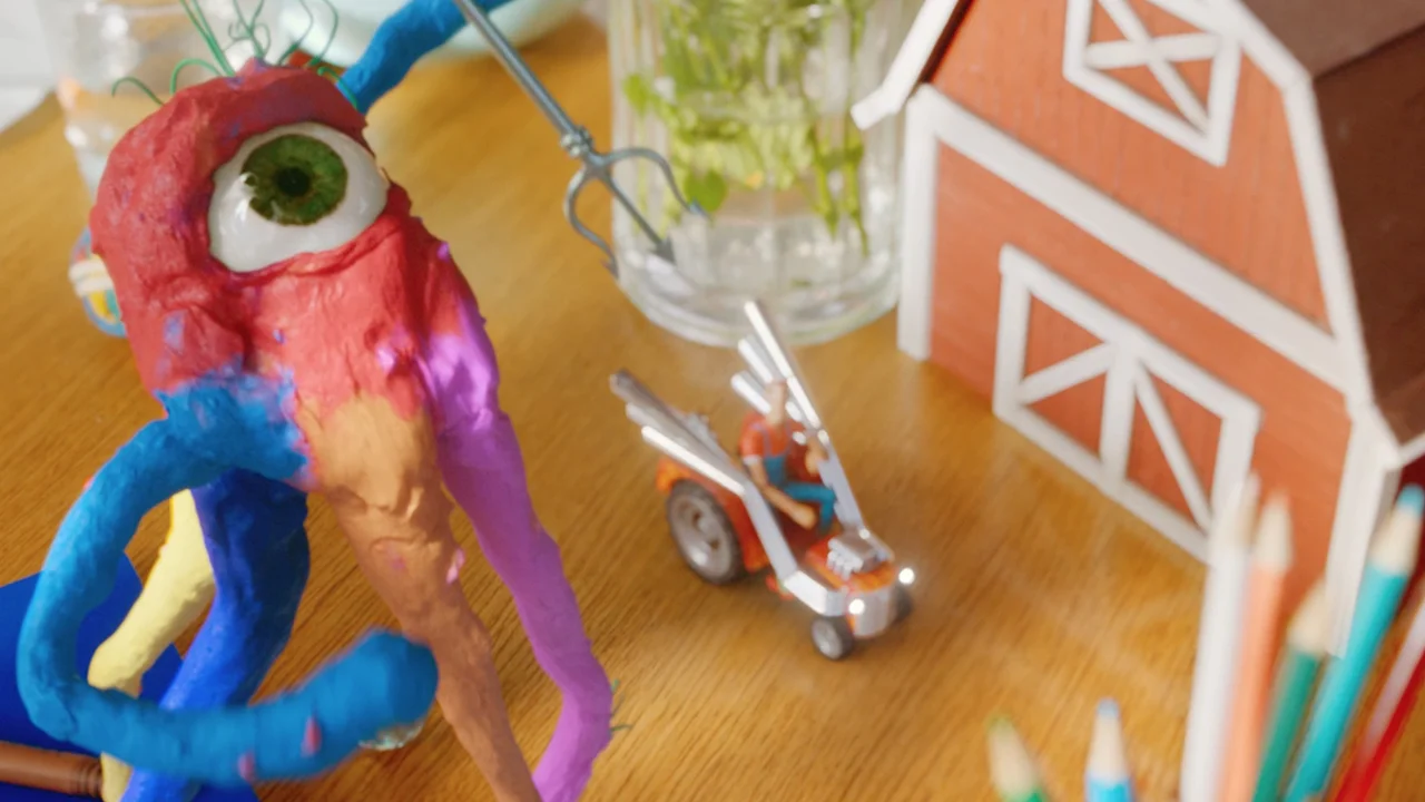 The heroic characters of the child’s epic and fantastical story, are revealed to be resourcefully hand made from paper and Playdoh when the child’s playtime is interrupted.
